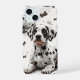 Seamless pattern featuring Dalmatian puppy and dog bones, digital art, high detail, soft shadows, white background.