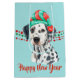 A beautiful Dalmatian Dog wears a red and green Santa Claus hat in front of strings of red and green Christmas beads on both sides of this gift bag. At the bottom are text fields in matching red for your own text. Currently one side says "Merry Christmas" and the other side says "Happy New Year", but you may change them if you'd like. The images and text are placed on a lighter mint green background. Be sure to see the matching products in our store.