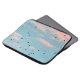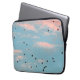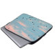 The pastel, dalmatian spotted print on this 13” Laptop Sleeve was created from an original photograph by ZoeSPEAK of an aqua blue sunset sky filled with puffy pink clouds and a flock of black birds. The birds become abstract black shapes scattered across the soft aqua and pink sky.