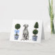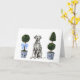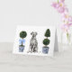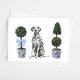 These greeting cards feature a watercolor portrait of a Dalmatian sitting in between two chinoiserie style topiaries.