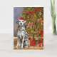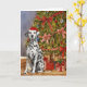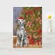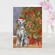 This Christmas card features a watercolor portrait of a Dalmatian wearing a Santa hat sitting under a Christmas tree.