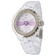 A Digitalbcon Images Design featuring an amethyst purple colour and damask design theme in this one-of-a-kind "Damask Amethyst Wedding Anniversary" Watch. This attractive and elegant design comes complete with contrasting colour clock face numbers and customisable text lettering to suit your own special occasion, making this the ideal anniversary gift for parents or spouse.