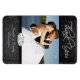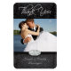 This Elegant Wedding Thank You photo flexible 4x6 magnet has a trendy black faded damask background with a shiny diamond and silver oval in the middle on top of a black band. At the top, Thank You is written in a sparkly silver colour. In the middle, you can easily customise this with a photograph of the bride and groom. At the bottom, you can easily personalise this with the names of the bride and groom.