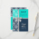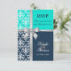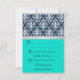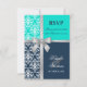 © 2013 Socialite Designs. Elegant wedding invitation RSVP card for a summer or winter wedding incorporating white damask, a printed cross silver ribbon and bow, and two background colours of navy blue and turquoise / aqua. Please contact Socialite Designs if you would like a different colour combination, help with customising, or other wedding products created with this design. PLEASE NOTE THAT THE RIBBON IS AN IMAGE AND IS PRINTED ONTO THE INVITATION.