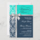 © 2013 Socialite Designs. Our elegant white damask rehearsal dinner invitation has a faux silver ribbon and bow design. The background has colours of aqua / turquoise and navy blue. All design elements and text are customisable. If you require additional matching wedding products such as save-the-date or thank you photo cards, please do not hesitate to contact Socialite Designs. PLEASE NOTE THAT THE RIBBON IS AN IMAGE AND PRINTED ONTO THE INVITATION.