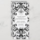 This dinner party menu design features a chandelier silhouette, bats, a spider and a black cat on a black and white damask background. You can personalise with all your menu details.