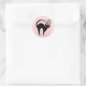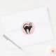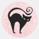 This sticker design features a black cat with a curly tail on a pink damask background.