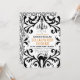 This whimsical design features a black ornamental damask style frame with a spooky cat, bats and a creepy spider. A chandelier hangs from the top sets the mood for this elegant party invitation. The back has a coordinating black damask pattern that is adorned with bats.