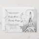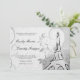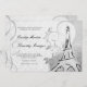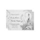 Swirls, reminiscent of a heart, billow and curl about a charcoal black hand-drawn Eiffel Tower against lavish, floral black and white damask. A French love poem is faintly inscribed in the ivory background, providing the perfect accompaniment to the customisable wedding invitation wording in script and engraving style fonts, in black and dark grey.