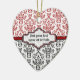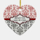 Damask pattern black red white custom ornament. The upper part is of red and white damask pattern and the bottom part is of black and white. A red stripe separates the two parts. Your text is typed on an elegant label with white and red outline. A great keepsake for special occasions weddings, birthdays, anniversaries.