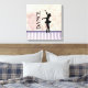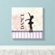 A cute canvas print with a silhouette of a ballerina on a pretty background. This elegant ballet dancer is standing on her toes, en pointe with her arms outstretched gracefully. The word "DANCE" beside this elegant dancer. The background is composed of a shabby vintage looking pattern with flower blossoms. The bottom portion of the design has vintage style lavender stripes alternating in dark and light colours.