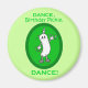 Funny design features a tortured-looking dancing pickle with a dangerously-shrinking lit birthday candle on his head. Text reads, "Dance, birthday pickle, dance!" Green background with ink pen cartoon.