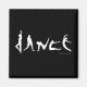 This dancer art refrigerator magnet has the word "Dance" spelled with dancing silhouettes of people in dance poses. One is a dance jump, one is ballet, one is jazz.