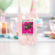 A stylish glass with dancing instructions, featuring a shaggy ostrich having a boogie, complete with striped party hat and polka dotted blower. Use "Personalise this template" to change the "DANCE like no one's watching" text if desired; text changes are reflected on both sides.