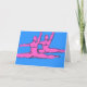 Two male dancers captured mid-air in a graceful double jete. Vibrant pink figures on a bright blue background.
