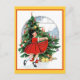 Adorable vintage Christmas card design with a little girl in red dancing around the decorated Christmas tree. The tree is in front of a round window.