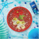 Dancing Baby Angels hanging from a Poinsettia flower with gold and white snowflakes falling on a red background to make very festive holiday paper plates.
