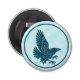 A simple, blue silhouette-like image of a lively raven (Corvus corax) done in Norse-Celtic style, superimposed on a snowy background image.