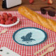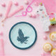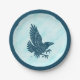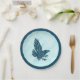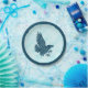 A simple, blue silhouette-like image of a lively raven (Corvus corax) done in Norse-Celtic style, superimposed on a snowy background image. Customise by adding your own text on the reverse side.