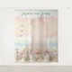 Dancing couple wedding backdrop / photo booth background. Pastel colors, with bottom border of wildflowers. A couple dancing is in silhouette over a background of pastel watercolors. Include the names of the bride and groom at the top in blue script. Also, list the marriage date in vertical numbers on the left side. Shown on the largest fabric, with smaller sizes available.