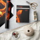 This wrapping paper depicts the energy of fire in a wood burning stove. The orange, gold and yellow flames appear as joyful dancing characters. They are set off by a black background.