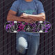 Tropical vintage print inspired by the aloha shirts of the sixties and the seventies. A colourful blend of pink and purple transitions through the hibiscus flowers from the top to the bottom of the board on a background of black, grey and white. Customisable to a large assortment of board shapes & sizes. These designs come in several colorways.