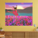 An African American ballerina dancer is depicted mid-leap above a vibrant field of pink and purple flowers, with mountains and a serene, sunset sky in the background. She is wearing a pink ballet outfit with matching shoes, joyfully expressing herself through movement in a picturesque, natural setting.