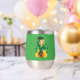 Wine Tumbler with an Illustration of a smiling happily dancing leprechaun wearing a green suit, a bow-tie, and a bowler hat; with black notes and a yellow and orange rainbow in green background.