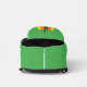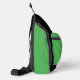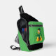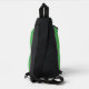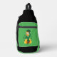 Sling Bag with an Illustration of a smiling happily dancing leprechaun wearing a green suit, a bow-tie, and a bowler hat; with black notes and a yellow and orange rainbow in green background.