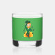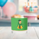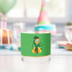 Whiskey Glass with an Illustration of a smiling happily dancing leprechaun wearing a green suit, a bow-tie, and a bowler hat; with black notes and a yellow and orange rainbow in green background.
