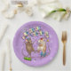 Cute dancing mice on paper plates. Use "Personalise this template" to tweak the "Rachel's 12th Birthday Party" text and create unique, customised party accessories. Plates featuring two happy mice in party hats, dancing as confetti and a ribbon fall around them, with balloons scattered on the floor, with a floral background.