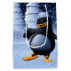 3D digital render of a cute dancing penguin wearing a sailor hat on a winter landscape background