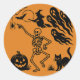 Halloween sticker featuring a dancing skeleton, black cat, jack-o’-lantern, witch, bats, ghosts, and spider on an orange background. Perfect for decorating party favours, scrapbooks, or gifts