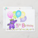 A purple teddy bear princess dressed up in a lovely yellow jewelled crown and pink, blue and green flowers is dancing through the flowers and holding a bunch of colourful balloons with the word HAPPY on them. This happy birthday postcard will bring a smile to a special girl on her 5th birthday. Personalise with her name to make it extra special. Original design by Anura Design Studio.