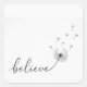 A minimalist design showcases a dandelion with its seeds blowing away, complemented by the elegant script of the word 'believe,' all set against a striking black and white colour scheme that highlights its simplicity and hopeful message