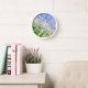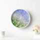 Round wall clock featuring a photo of dandelion seeds covered with tiny dew droplets and white numerals.
