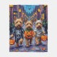 Adorable Dandie Dinmont Terriers dressed in playful Halloween costumes carry pumpkin buckets while trick-or-treating under the moonlit sky. This festive design highlights the breed’s distinctive long body, fluffy topknot, and gentle yet spirited personality, perfectly capturing the spooky yet fun atmosphere of Halloween night. A delightful celebration for dog lovers and Halloween fans alike.