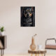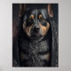 A fierce looking Rottweiler in a black leather jacket and chains.