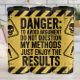 This bold, humourous warning sign features "DANGER:" atop a distressed yellow background with black hazard stripes. The assertive message reads: "TO AVOID ARGUMENT / DO NOT QUESTION / MY METHODS / JUST ENJOY THE / RESULTS" in stark black lettering. Skull and exclamation mark warning triangles reinforce its no-nonsense, edgy appeal.