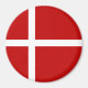 The red and white flag of Denmark, or Dannebrog, has a Nordic or Scandinavian Cross. The red is the background, the cross is in white. The Danish flag shows here on a round magnet.