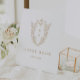 The simple yet classic design features an elegant and timeless ornate crest monogram with florals and greenery surrounding the initials of the couple.