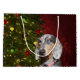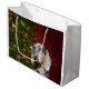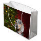 Short haired dappled dachshund, or weiner dog, face with a Christmas tree and holiday colours in the background dog lovers large Christmas holiday gift bag