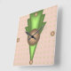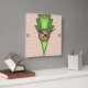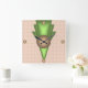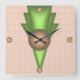 10.75” x 10.75” acrylic wall clock with an image of a glowing green Art Deco ornament with a glowing gold orb on a background of green polka dots on peach. Gold orbs mark the 12, 3, 6, and 9 positions.