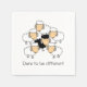 Funny black sheep napkins. A group of white sheep with pink faces and grey ears are surrounding a woolly black sheep, also with a pink face and grey ears. Below is a caption "dare to be different" in black lettering.