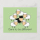 Funny black sheep postcard. A group of white sheep with pink faces and grey ears are surrounding a woolly black sheep, also with a pink face and grey ears. Below is a caption "dare to be different" in black lettering.