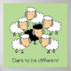 Funny black sheep print. A group of white sheep with pink faces and grey ears are surrounding a woolly black sheep, also with a pink face and grey ears. Below is a caption "dare to be different" in black lettering.