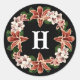 This last name monogram sticker combines elegance with a bold, dark aesthetic, making it perfect for a sophisticated touch on favours, gift bags, or invitations. The design features a central monogram letter in classic white, set against a deep black background. Surrounding the initial is a beautifully arranged wreath of lush flowers in rich shades of blush pink and warm orange, accented by vibrant green leaves. This sticker adds a refined, personal touch to any event, ideal for those looking to incorporate a dark, romantic floral theme into their decor.