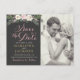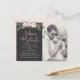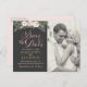 Our vintage boho floral wedding photo save the date announcement postcard features a moody floral arrangement of romantic roses, peony and anemone flowers, greenery, and rustic bohemian feather accents in rich shades of dusty rose, mauve pink, cassis, creamy white, moss green, grey, and gold on a dark grey / black background colour. A dramatic and dreamy colour scheme for your fall or winter wedding. Personalise the photo and beautiful custom text for your elegant rustic wedding day.
