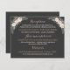 Our vintage boho floral wedding information details card features a moody floral arrangement of romantic roses, peony and anemone flowers, greenery, and rustic bohemian feather accents in rich shades of dusty rose, mauve pink, cassis, creamy white, moss green, grey, and gold on a dark grey / black background colour. A dramatic and dreamy colour scheme for your fall or winter wedding. Personalise the beautiful custom reception, accommodations, and wedding website text for your elegant rustic wedding day.