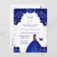 This elegant and glamourous birthday party invitation features a beautiful princess with brown hair in a dark blue ball gown. The text combines handwritten script and modern sans serif fonts for a classy and sophisticated look. The floral arrangements, butterfly and silver confetti create the perfect blend of rustic and chic.